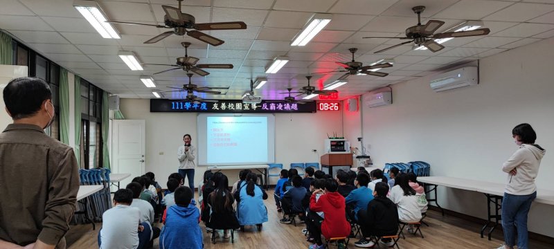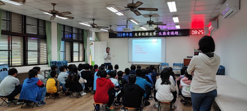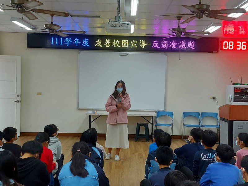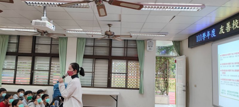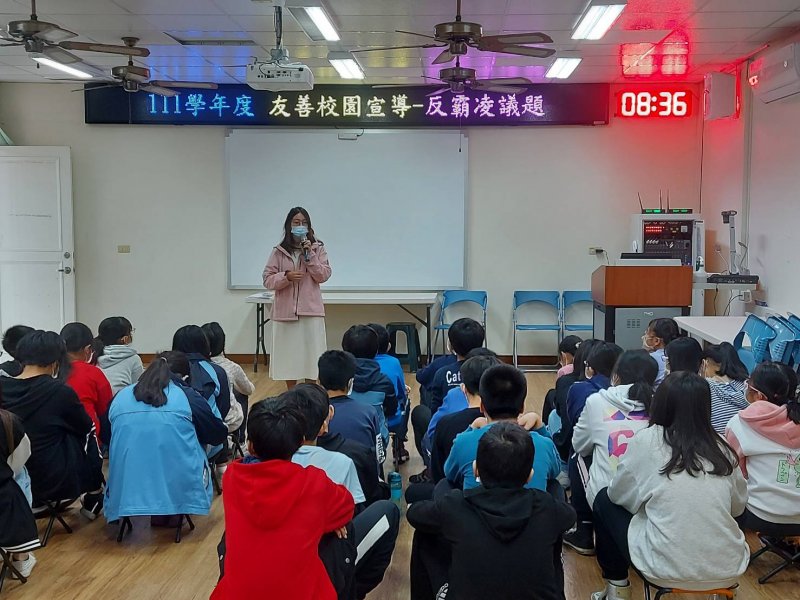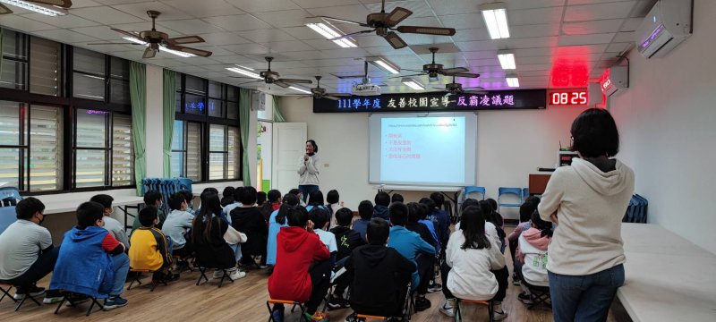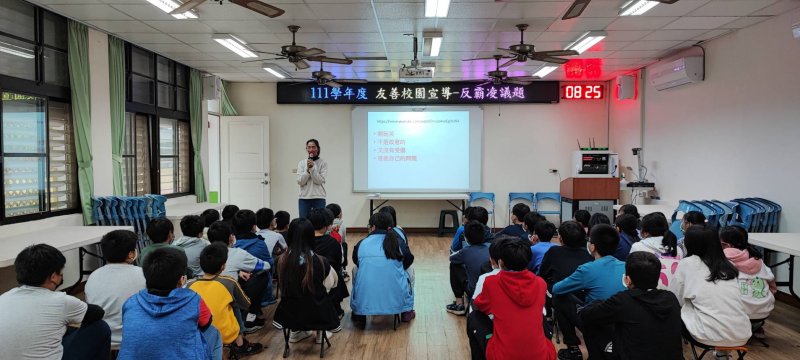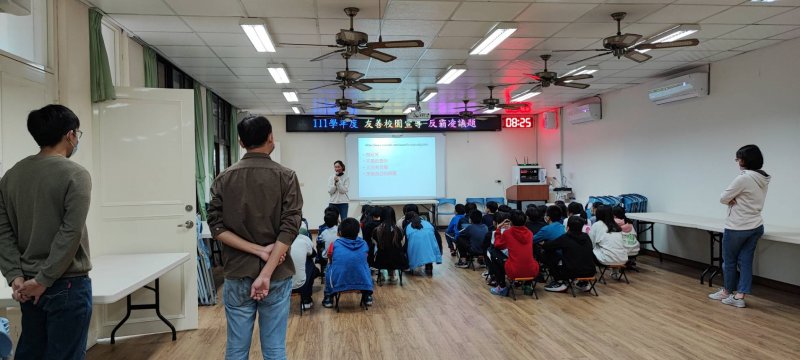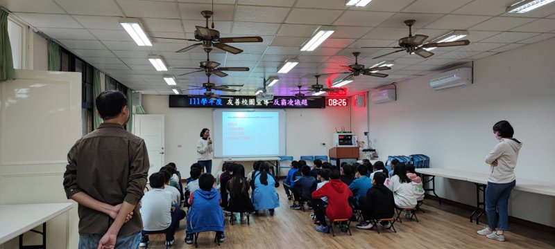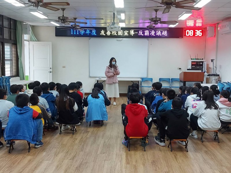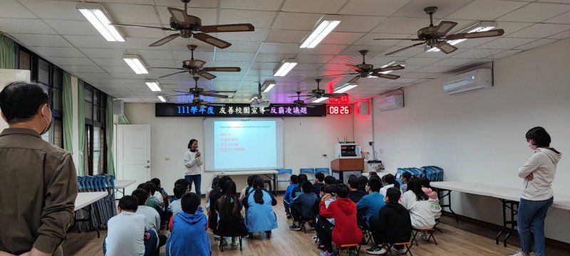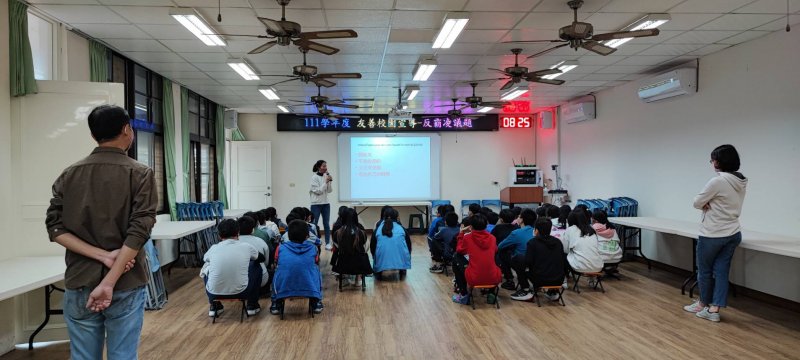 學生活動組針對校園中常見的霸凌樣態做說明、學校處理霸凌事件流程,希望大家共同營造友善的校園環境。最後由專輔老師總結,當自己有困難、有情緒時,歡迎找專輔老師聊聊。