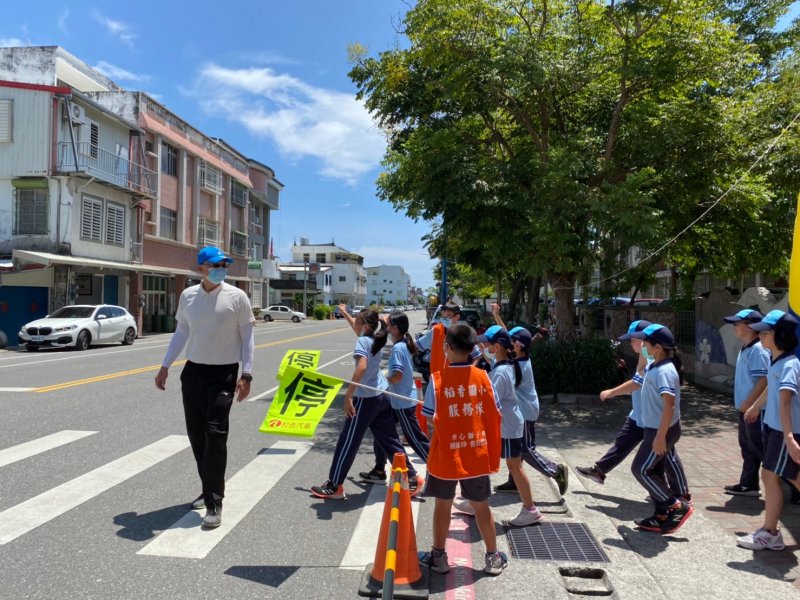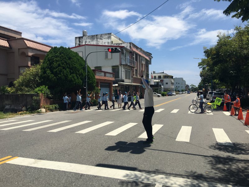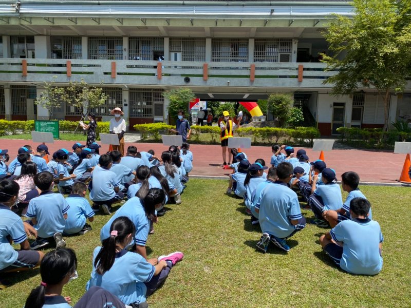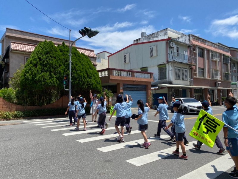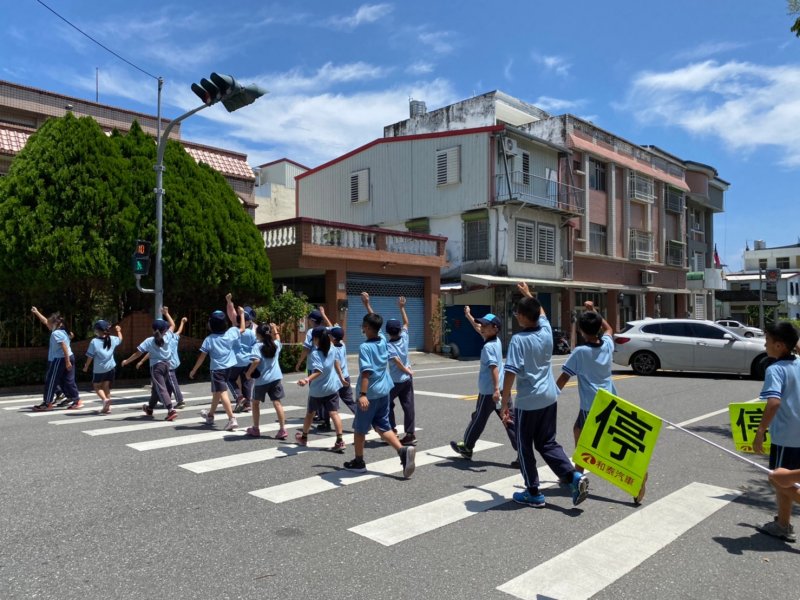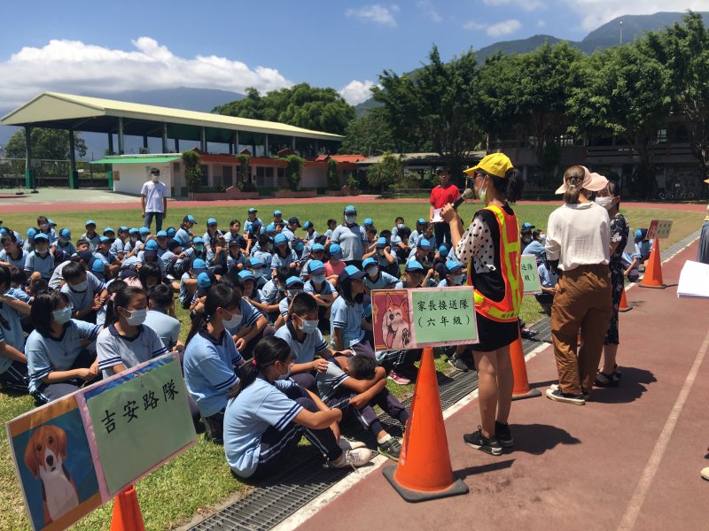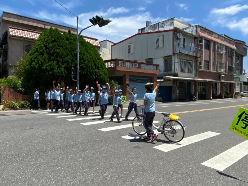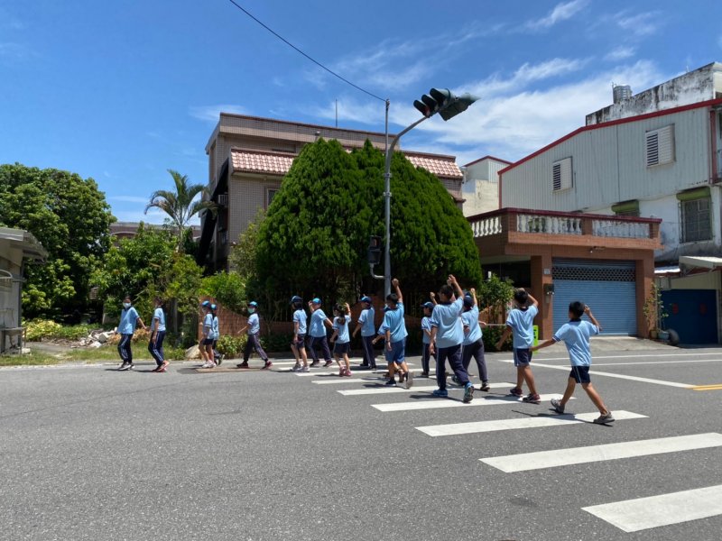 開學日當天進行放學路隊編組、做交通安全宣導:著亮衣、遵守交通規則、舉手穿越馬路、自行車配備等,最後各路隊指導老師帶領學生實際演練、建立正確的用路觀念。