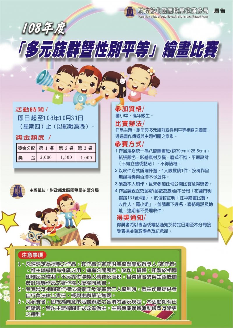 為落實性別主流化之推動,創新推展性別平等概念,財政部北區國稅局分局舉辦108年度「多元族群暨性別平等」繪畫比賽,