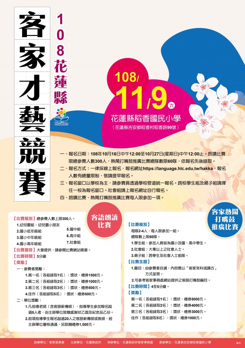 項目:「客語朗讀比賽」及「客家熱鬧打嘴鼓推廣比賽」,對象:幼兒園、低、中、高年級組,日期:11/9(六),地點:稻香國小。