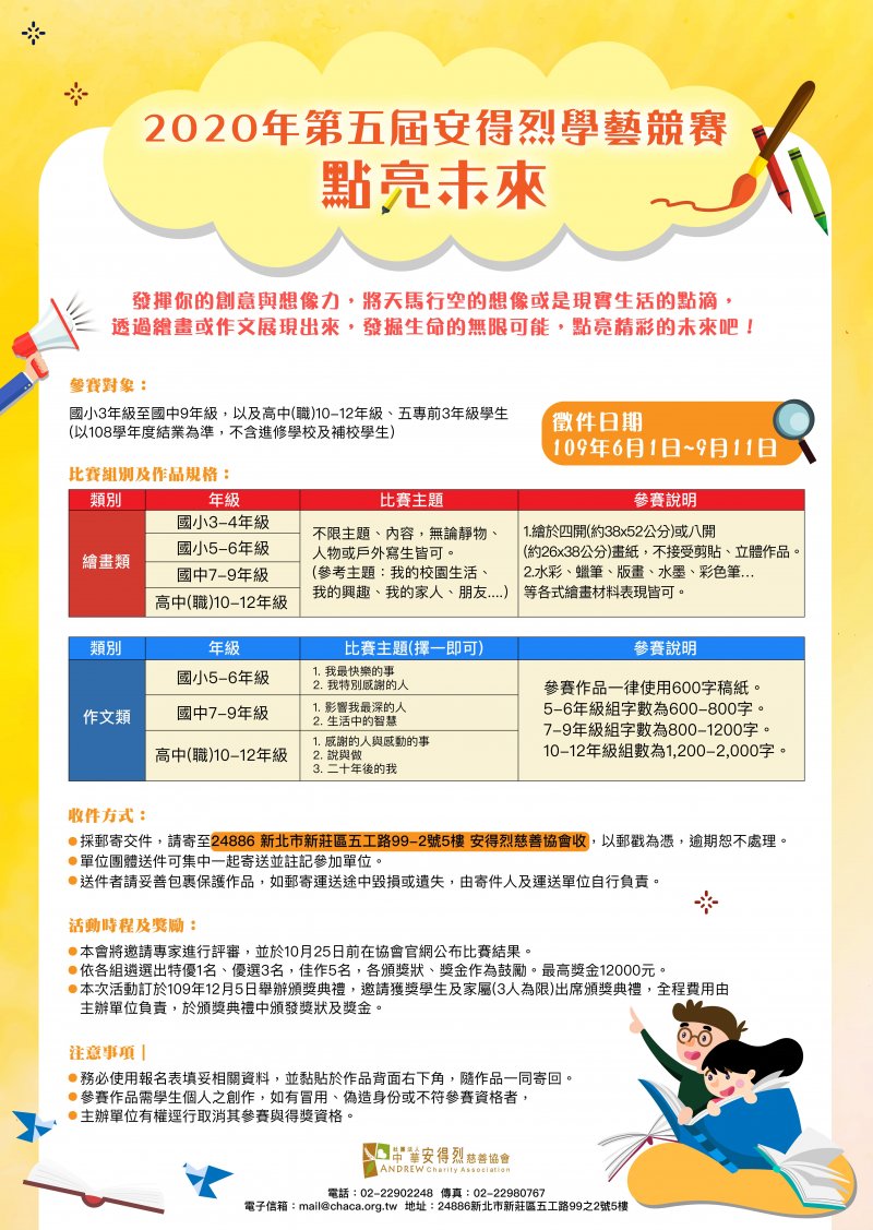 一、 為增進台灣偏鄉、(中)低收入戶、清寒弱勢家庭兒少閱讀寫作及美術繪畫的興趣與能力,特別舉辦「作文、繪畫」之學藝競賽活動,以激發學生在文字與繪畫藝術方面的想像力與創作力,鼓勵有志於相關領域創作的學生發揮才華。