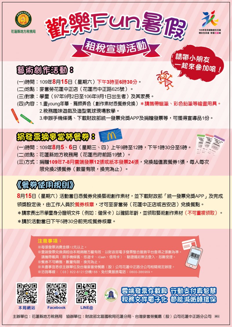 落實租稅教育向下紮根,暑假期間透過親子共同參與,提升家長及學生對租稅的認知,花蓮縣地方稅務局訂於本(109)年8月15 日(星期六)舉辦「歡樂Fun暑假」租稅宣導活動。