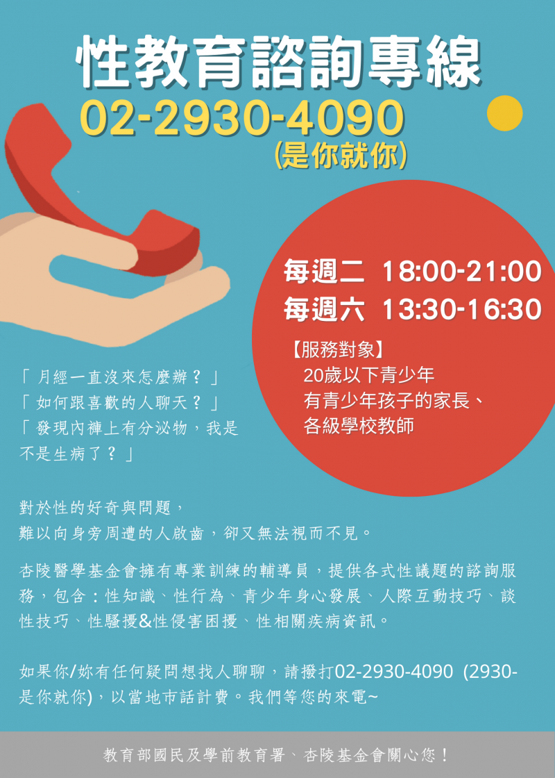 | (二) | 諮詢服務:性知識、性行為、青少年身心發展、人際互動技巧、談性技巧、性騷擾&性侵害困擾、性相關疾病資訊。 |