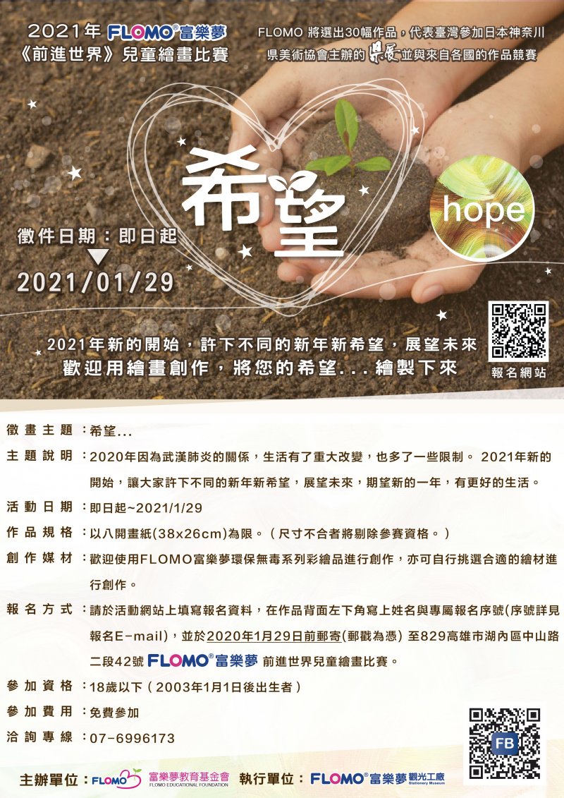 | 一、 | 為讓臺灣孩子藉由畫作走出國門,前進世界,也讓世界感受臺灣孩子豐沛的創作能量,FLOMO富樂夢自2016年起與日本神奈川縣美術家協會主辦的《県展》合作,將臺灣徵選的優秀作品送至日本展出,並與來自各國的兒童作品競賽。截至2020年已有逾千位小朋友參加甄選,作品頗受日本美術界肯定,數次奪得日本県展JUNIOR賞青少年獎等殊榮。 |