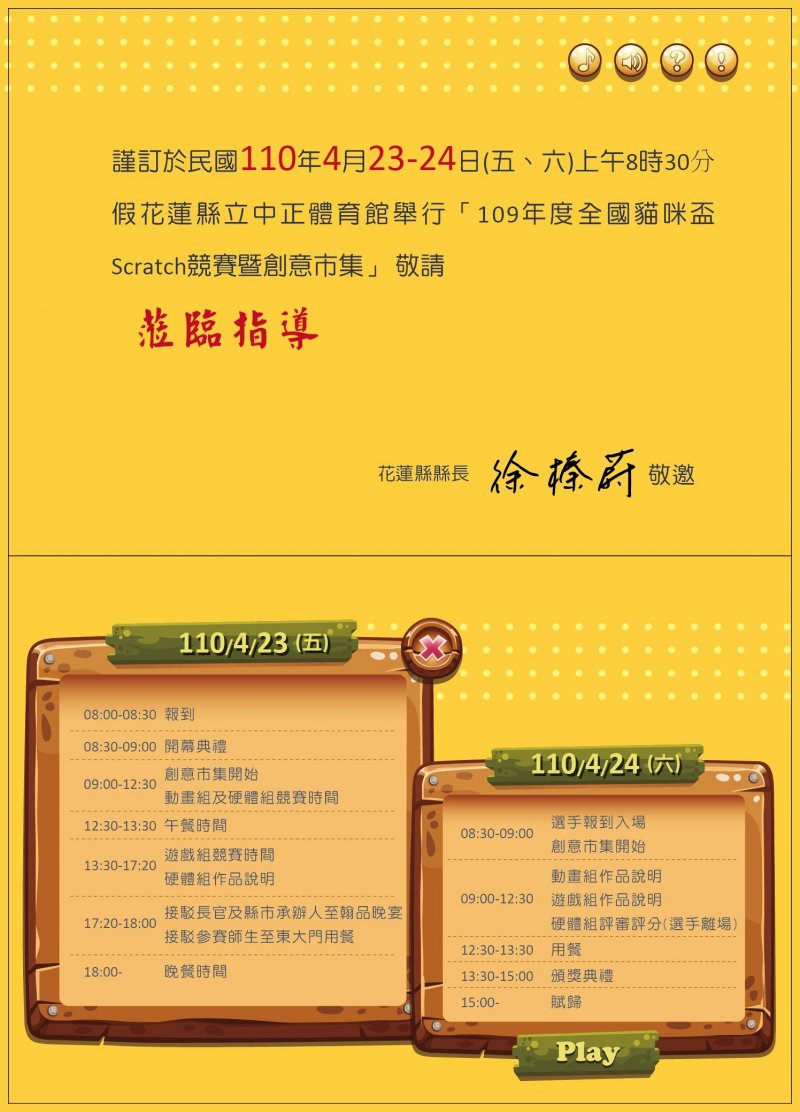 花蓮縣政府辦理「109年度全國貓咪盃SCRATCH競賽暨創意市集」,敬邀師生共襄盛舉