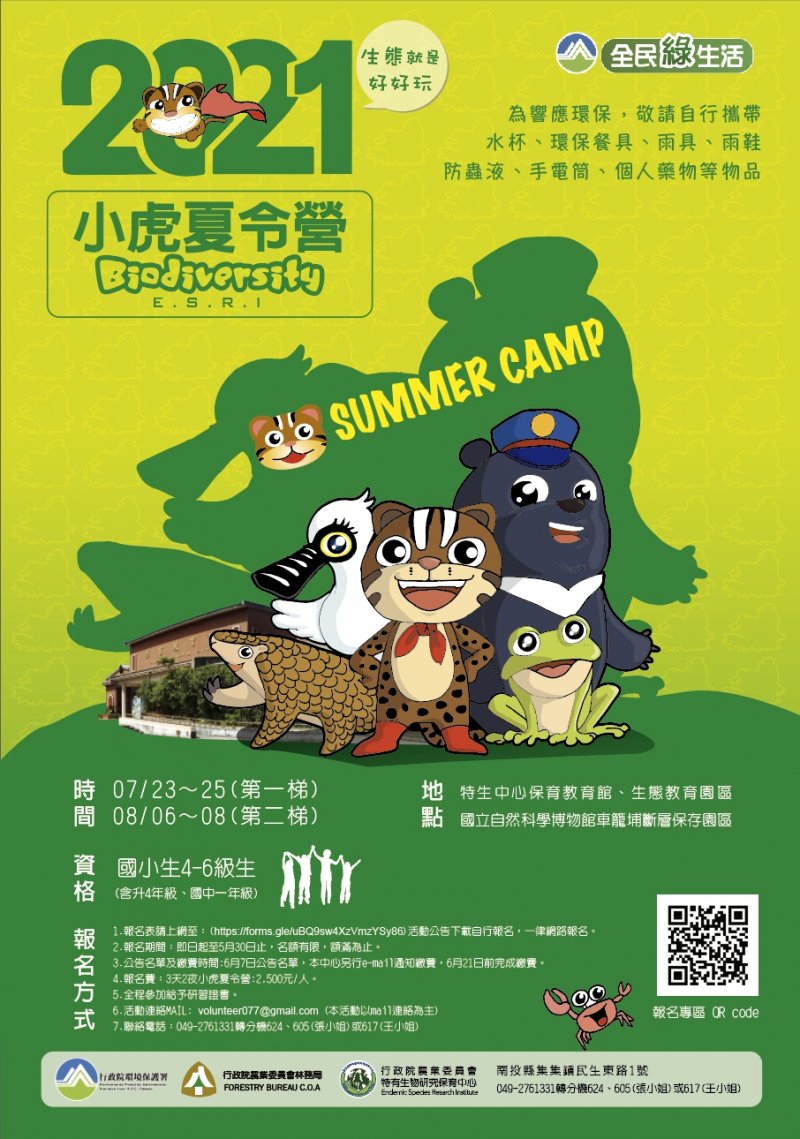 轉知行政院農業委員會特有生物研究保育中心將於110年7-8月暑假期間,辦理2梯次「三日小虎夏令營」訊息