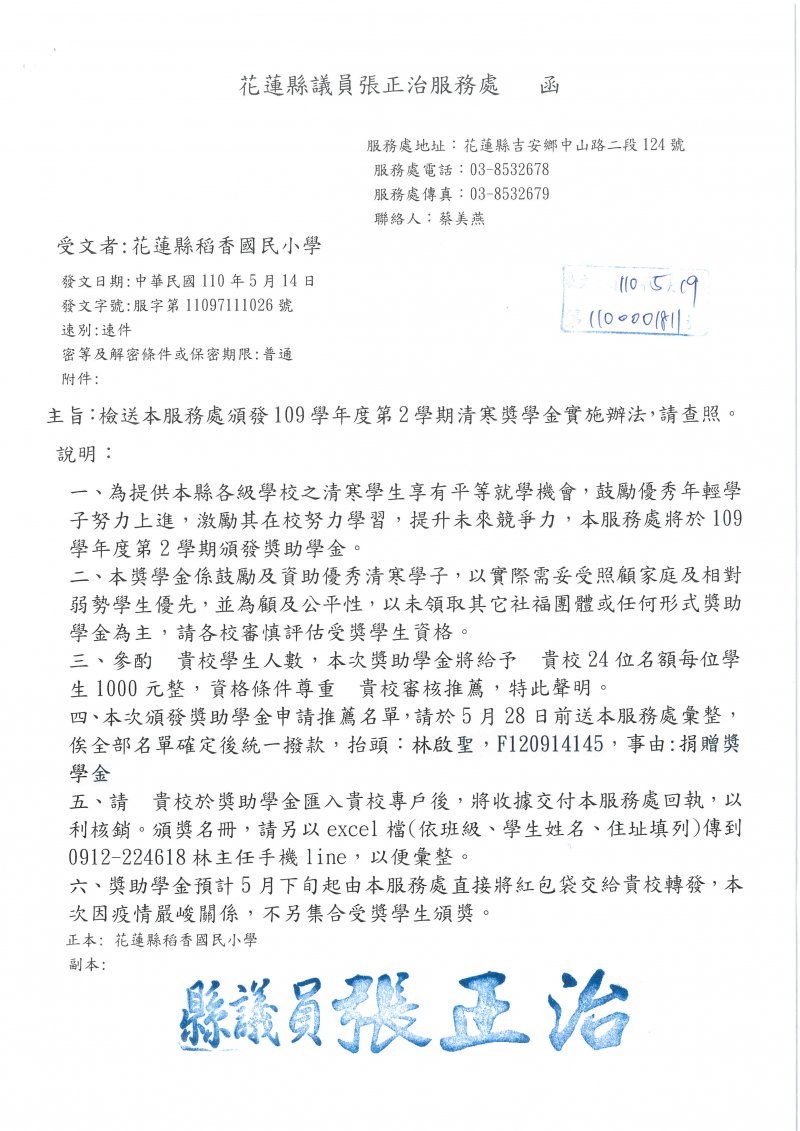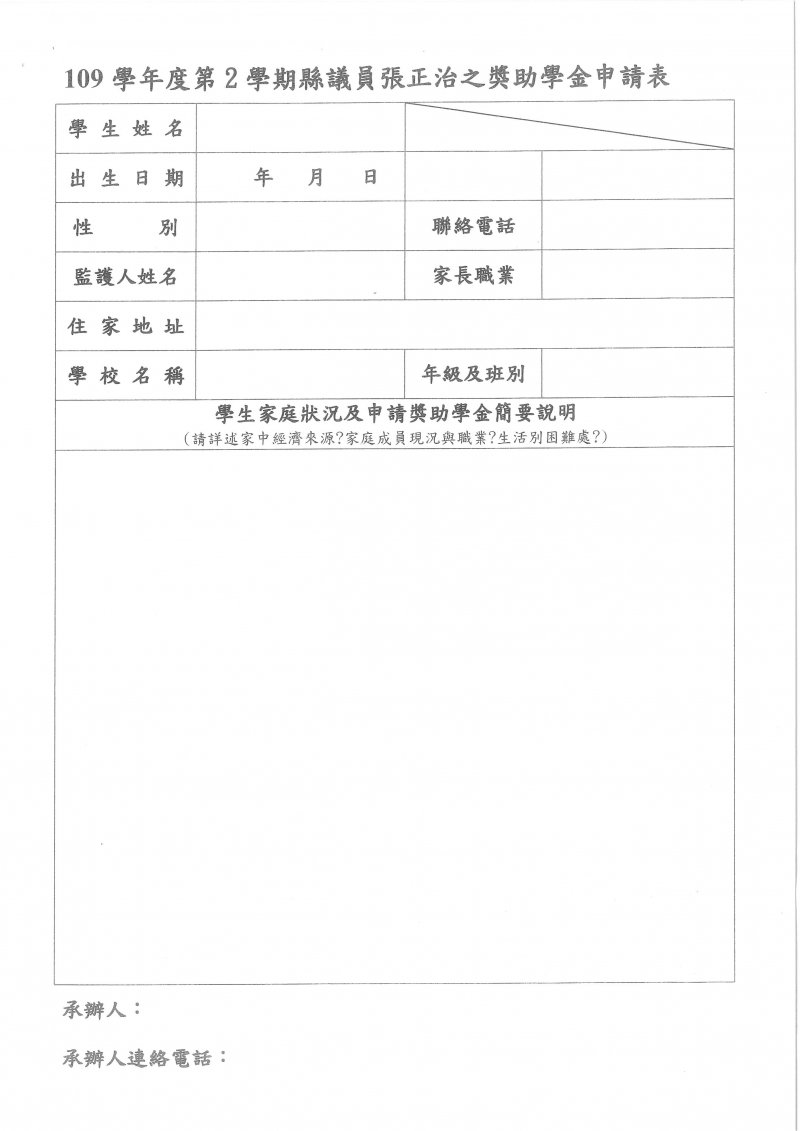 109學年度第2學期(張正治)清寒獎學金實施辦法