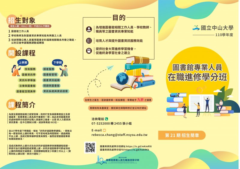 | 四、 | 檢附招生簡章、報名表、繳費流程說明,意者請於110年 8月15日前,將報名表、相關證明文件及繳費收據影本寄交國立中山大學圖書與資訊處知識創新組張小姐收。 |