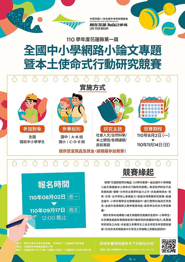 | 一、 | 依據「花蓮縣教育扶輪盃110學年度第一屆全國中小學網路小論文專題暨本土使命式行動研究競賽實施計畫」辦理。 |