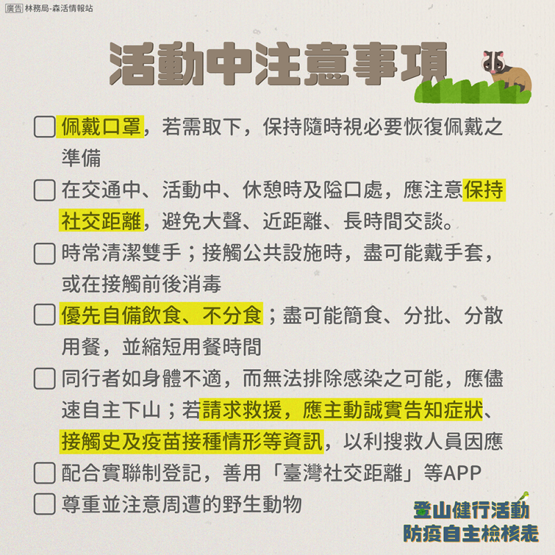 轉知臺灣山林登山健行活動新冠病毒防疫自主檢核表」暨其圖卡1份