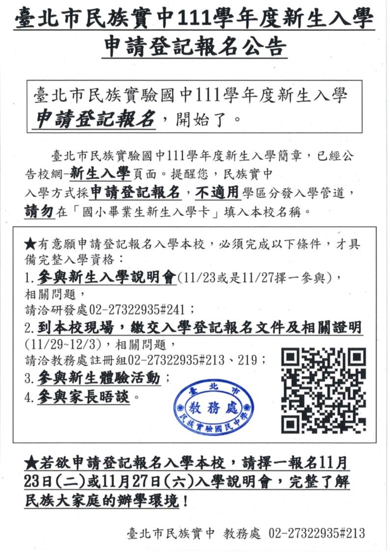 轉知「臺北市民族實驗國民中學111學年度新生入學申請登記報名事宜」,請查照。