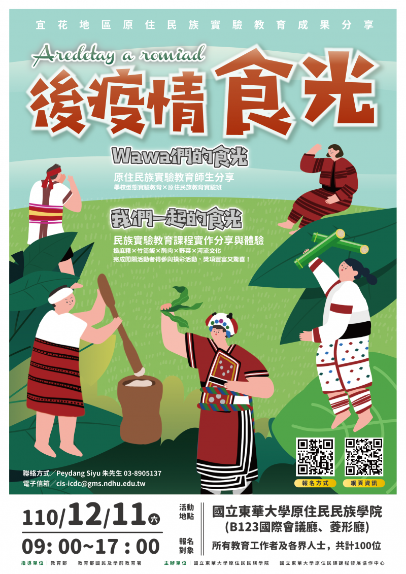 | 主旨: | 函轉國立東華大學原住民族課程發展協作中心辦理「Aredetay a romi'ad後疫情食光:宜花地區原住民族實驗教育成果分享」實施計畫書及活動海報各乙份,請鼓勵貴校教師踴躍報名參加,請查照。 |