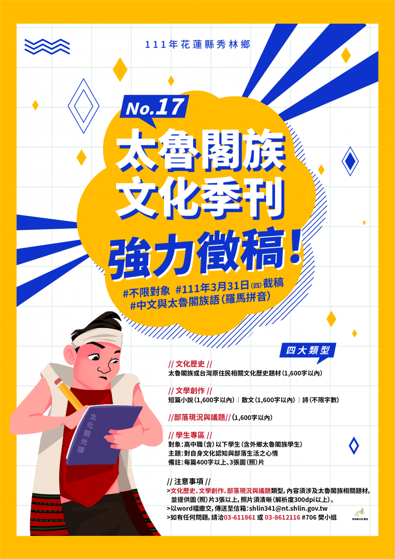 | 主旨: | 檢送本所辦理111年度「太魯閣族文化刊物製作出版計畫」-第17期文案徵稿,惠請廣為宣傳周知,詳如說明,請查照。 |