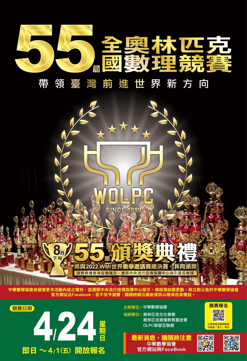 | 主旨: | 本會為推廣幼兒、國小及國中之數理教育,謹訂於111年4月24日(星期日)舉辦 「第55屆全國奧林匹克數理競賽」,旨在培養學童對數理的興趣,為國家培育優秀人才。建請 貴校公告並推薦學生參加競賽,以提升數理教育,歡迎共襄盛舉。請 鑒核。 |
