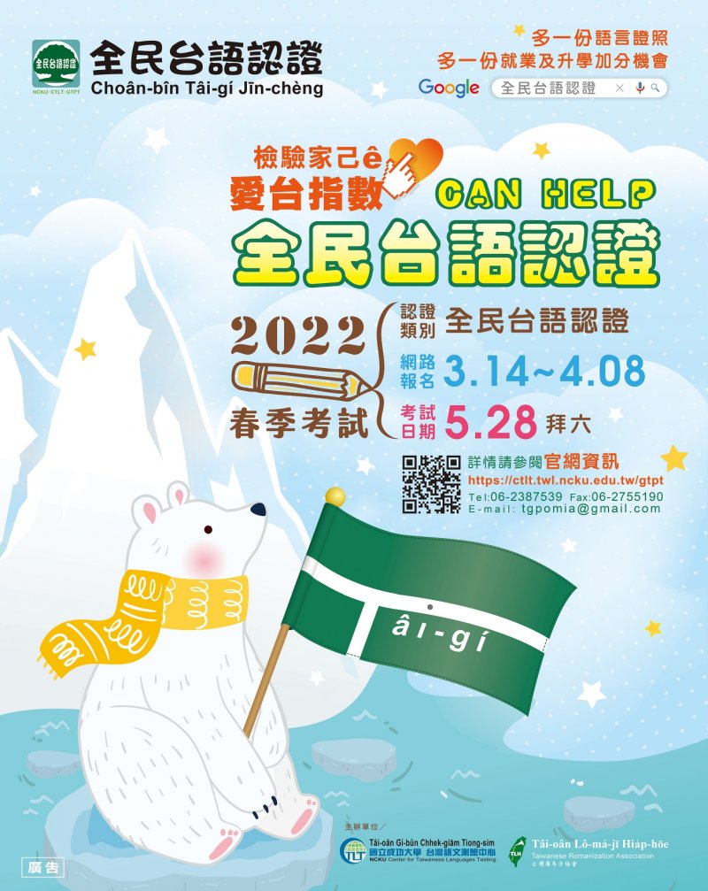 | 二、 | 國立成功大學台灣語文測驗中心於本(2022)年5月28日(六)擴大辦理「2022春季全民台語認證」,網路報名時間為本年3月14日至4月8日,簡章及詳細資訊請至該中心官方網站查詢:https://ctlt.twl.ncku.edu.tw/gtpt/index.html。 |