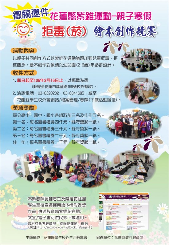 花蓮縣學生校外生活輔導會辦理106年度「紫錐運動-親子寒假拒毒(菸)繪本創作競賽」活動辦法,如附件。歡迎親子踴躍參加。