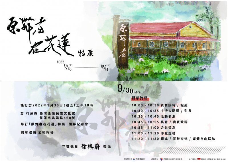| 主旨: | 檢送本府花蓮縣臺灣原住民族文化館「原舞者在花蓮特展」電子邀請卡及宣傳海報各1份,請協助運用多元管道宣傳並敬邀貴單位出席開幕活動,請查照。 |