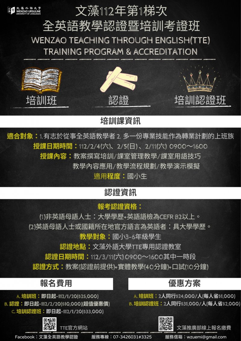 | 主旨: | 文藻大學開辦全英語教學認證(TTE)暨培訓課程,懇請惠予公告並轉知所屬教師(教職員)參加。 |