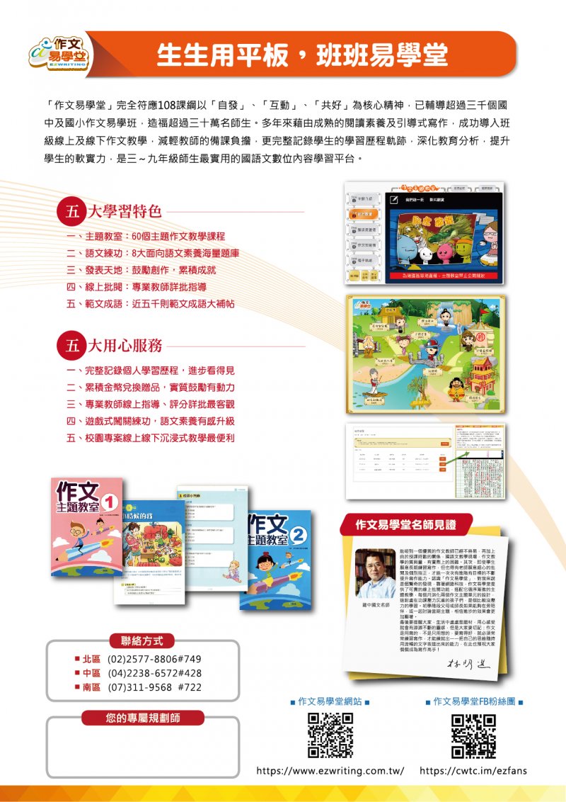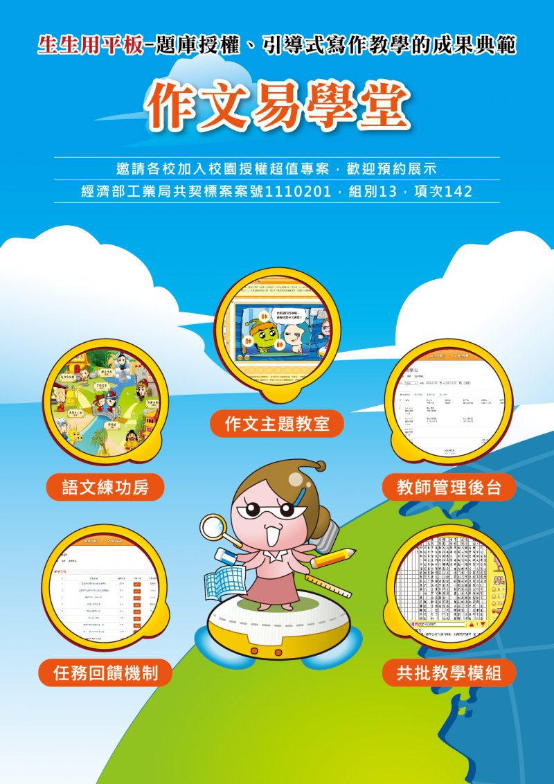 | 三、 | 「作文易學堂」多年來已輔導超過三千個國中、小班級,藉由前臺成熟的閱讀素養遊戲式題庫及引導式寫作教學動畫模組,減輕教師備課與公開課的負擔,也提供教師與行政窗口專屬後臺,可一鍵匯出學生作品集,以及班級學習歷程紀錄,利於呈報計畫成果、教學評鑑,深獲各縣市教育局處肯定。 |