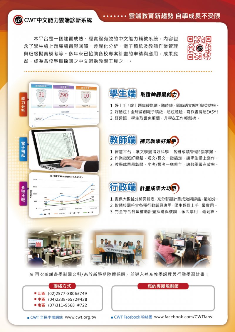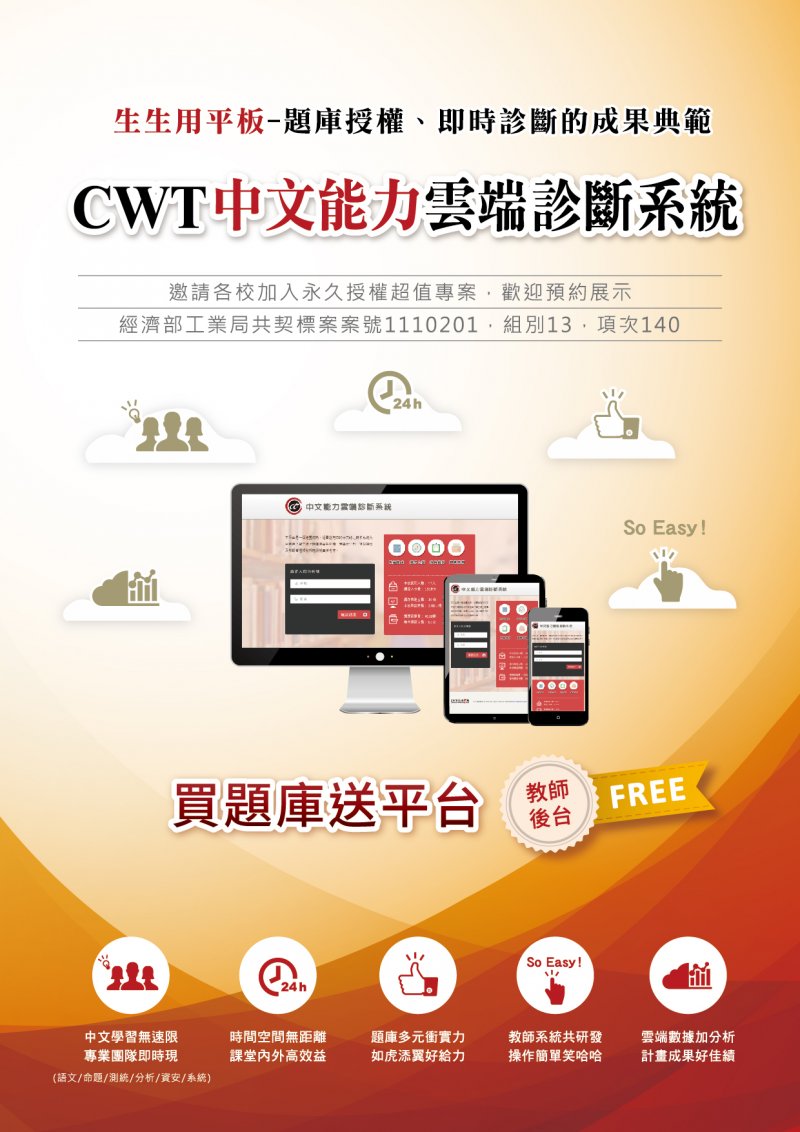 | 二、 | 「CWT中文能力雲端診斷系統」提供高中職學生可自學的語文素養化題庫,教師可用以進行多元評量、作業派發與管理,其獨創的作文批閱模組、教育統計模組深受好評,更能完整記錄、匯出個人「學習歷程」,凸顯學生能力亮點,彰顯教師教學成效,實證有助於提升學生中文力。 |