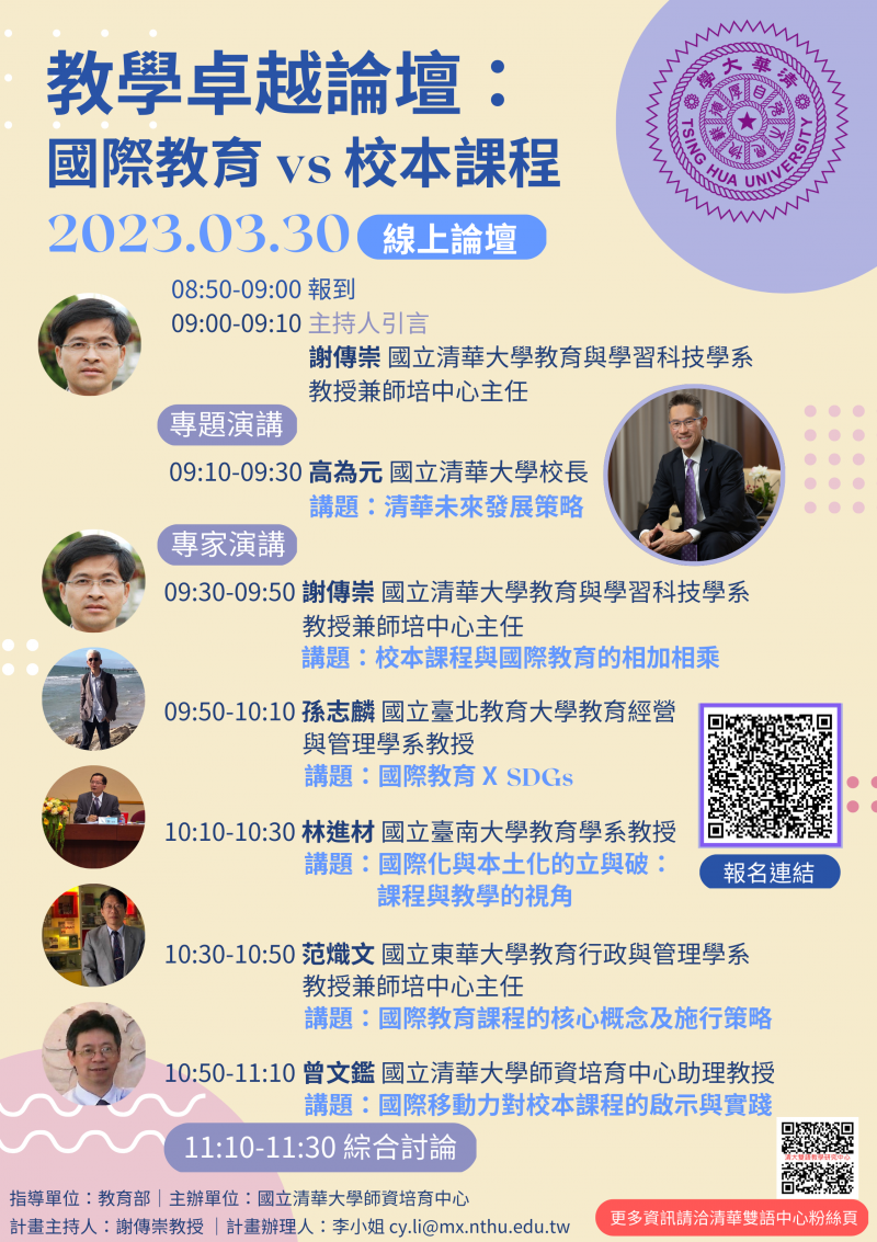 | 二、 | 旨揭線上論壇以「教學卓越:國際教育 vs 校本課程」為主題,特邀請國立清華大學校長高為元演講,藉由專家學者探索教育理論與實務,期許透過國際教育與校本課程的連結,使學生及學校當局可以立足在地,學習國際、放眼全球,而照亮國際教育的校本課程發展之路,培育學生成為具備全球移動力與競合力之國際化人才。 |