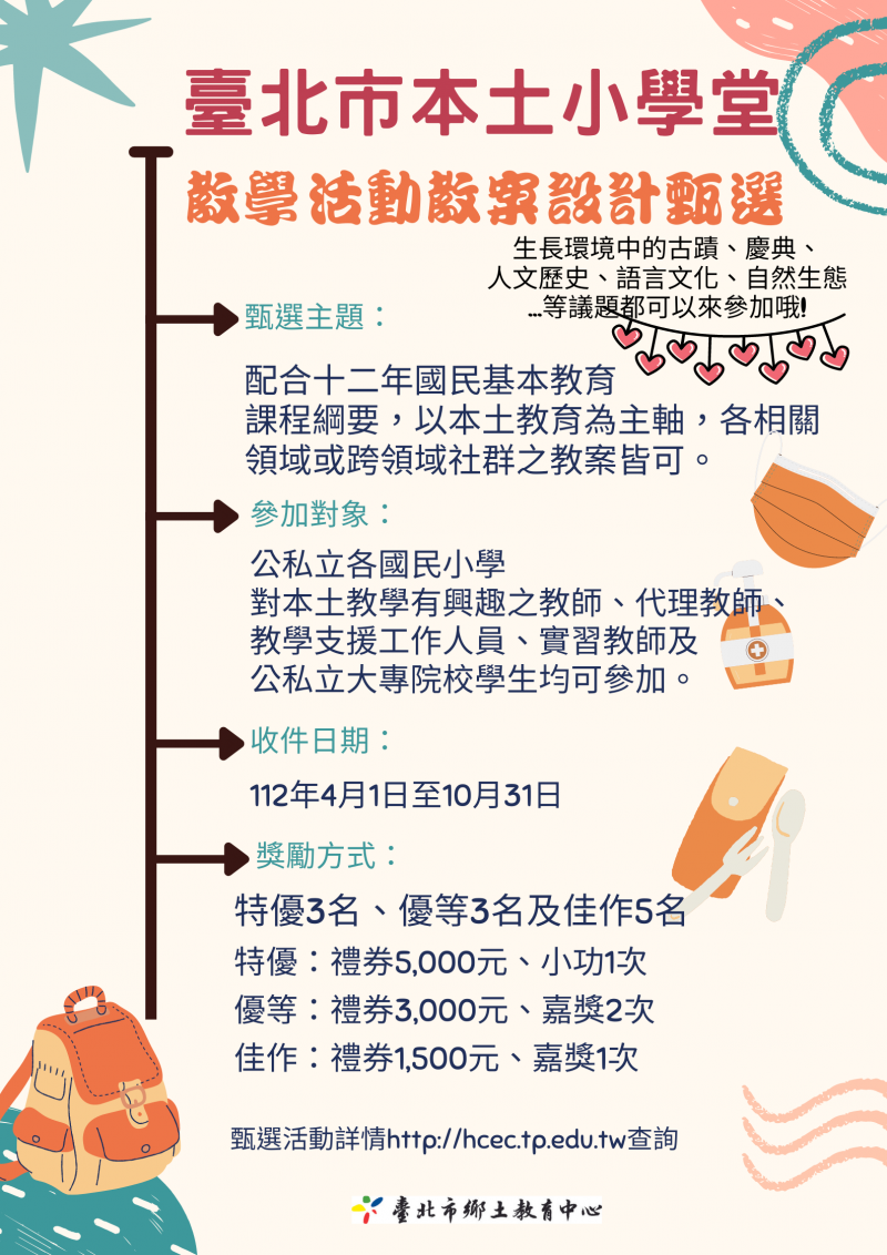 | 主旨: | 轉知臺北市鄉土教育中心辦理112年度「臺北市本土小學堂」教學活動教案甄選計畫及宣傳海報如附件,請協助轉知並鼓勵教師踴躍參加,請查照。 |