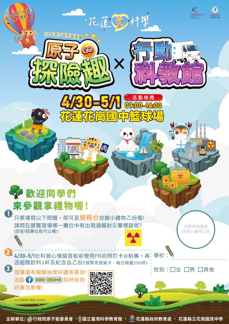 | 二、 | 另本府與行政院原子能委員會、國立台灣科學教育館訂於112年4月30及5月1日辦理花蓮愛科學園遊會活動,請各校將活動DM夾聯絡簿協助宣導,供家長、老師、學生相關訊息,餐與活動,共襄盛舉。 |