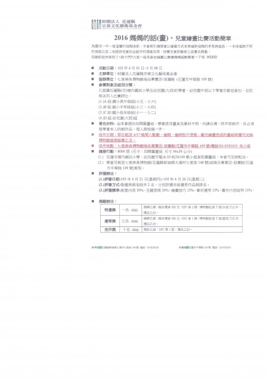 財團法人花蓮縣宗泰文化藝術基金會辦理2016媽媽的話(畫)比賽