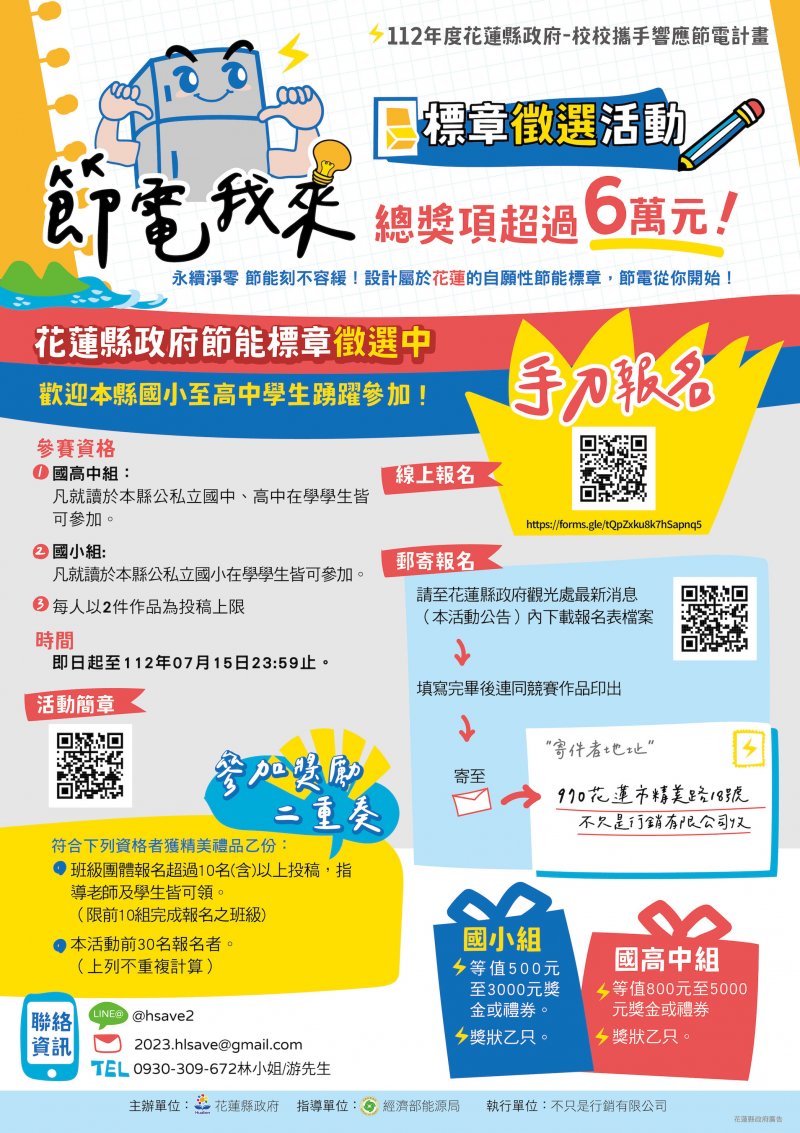 2.本案採線上及紙本兩種方式報名,並分為國小組、國高中組進行競賽,將針對作品之傳達理念與節能意象、標章美感、結合花蓮元素程度、創意度、整體完整度作為評選項目,最優勝之作品則為本年度本縣自主節能標章並張貼於本縣符合條件之自主節能場所
