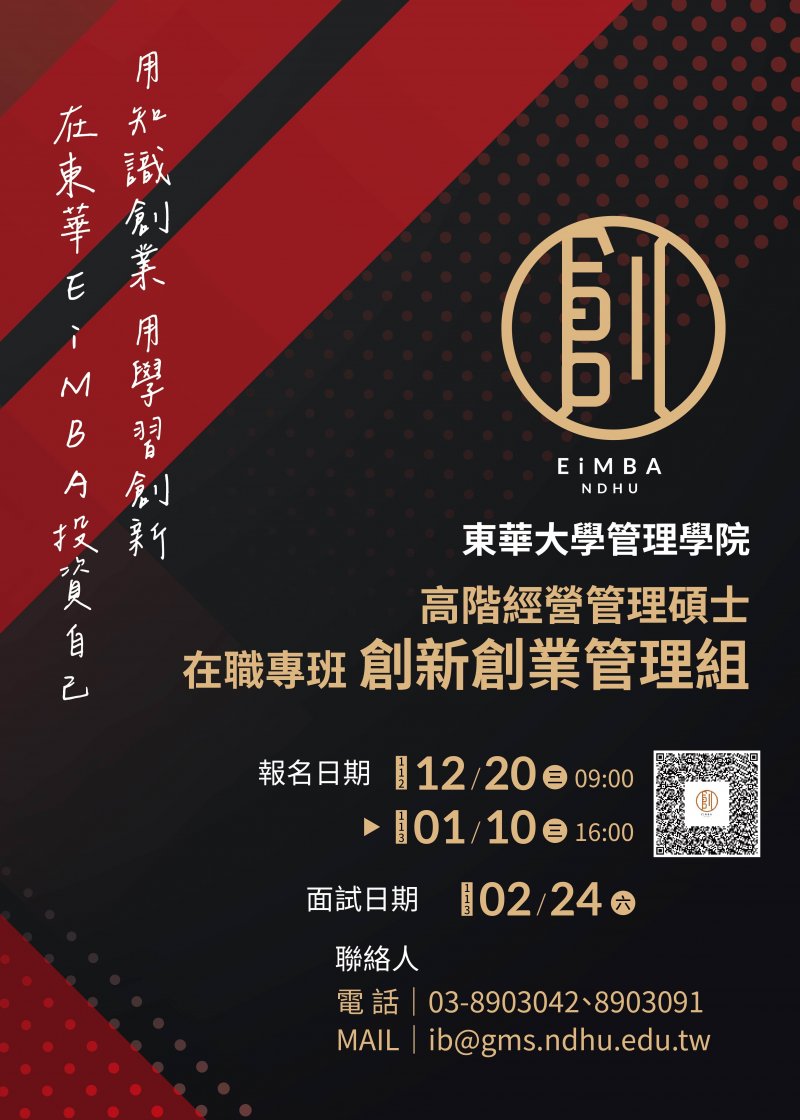 函轉本校管理學院高階經營管理碩士在職專班創新創業管理組113學年度碩士在職專班招生考試資訊,敬請惠予公告周知並轉知所屬,歡迎踴躍報考