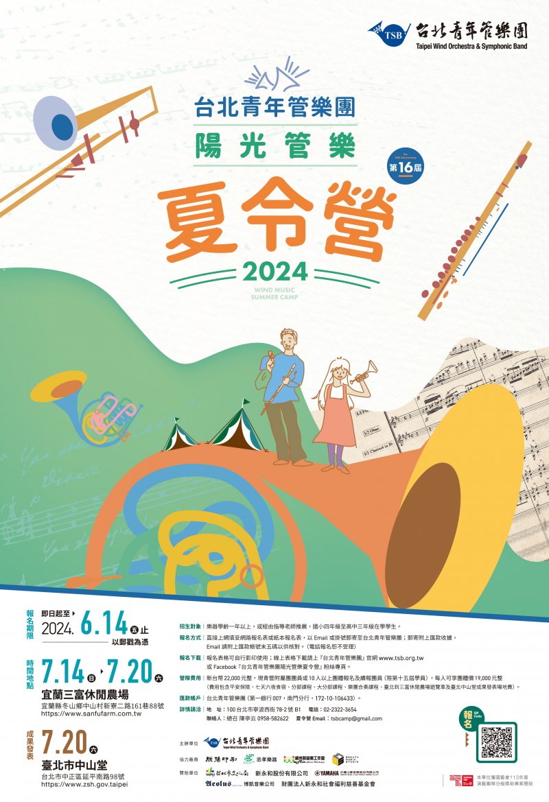 | 一、 | 台北青管暑假最受歡迎的陽光管樂夏令營,聘請專業師資,規劃豐富充實課程,並規劃於113年7月20日(六)下午2點30分假臺北市中山堂中正廳舉辦成果發表會,歡迎喜愛管樂演奏學生踴躍報名參加。 |