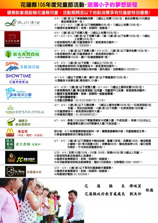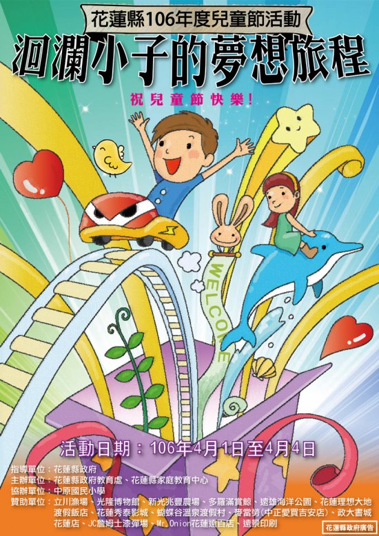 為歡慶一年一度兒童節,由本府號召縣內設有文教及遊樂設施等12家知名企業共同合作,於兒童節期間(106年4月1日~4月4日)舉辦「洄瀾小子的夢想旅程」活動,邀請本縣學童享有免費入場,大小朋友親子同樂更享有特別優惠,祝花蓮孩子兒童節快樂!請家長踴躍陪伴學童前往,以增進親子互動,落實家庭親職教育。