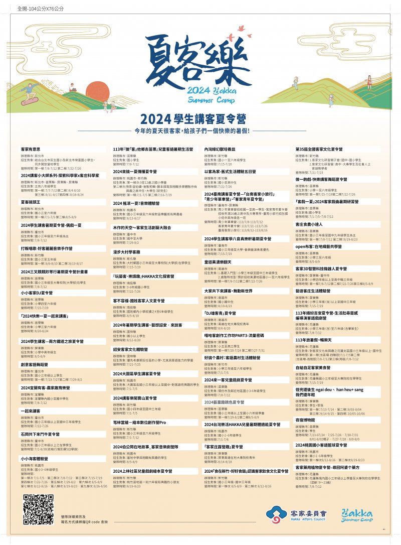 | 三、 | 檢附旨揭活動一覽表1份供參,相關訊息同步公告於本案網頁(https://hakkasummercamp.hakka.gov.tw/)及客家委員會官方網站(http://www.hakka.gov.tw),歡迎上網瀏覽。 |