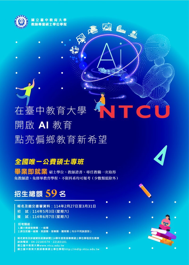 主旨:檢送台中教育大學教師專業碩士學位學程114學年度招生海報電子檔1份,敬請惠予公告,請查照。