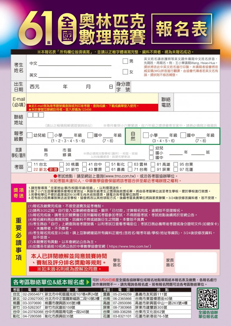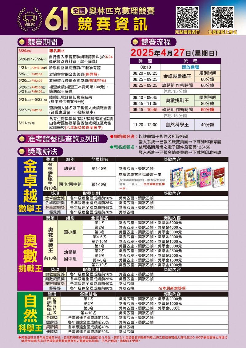 主旨:本會為推廣幼兒、國小及國中之數理教育,謹訂於114年4月27日(星期日)舉辦 「第61屆全國奧林匹克數理競賽」,旨在培養學童對數理的興趣,為國家培育優秀人才。建請 貴校公告並推薦學生參加競賽,以提升數理教育,歡迎共襄盛舉。請 鑒核。