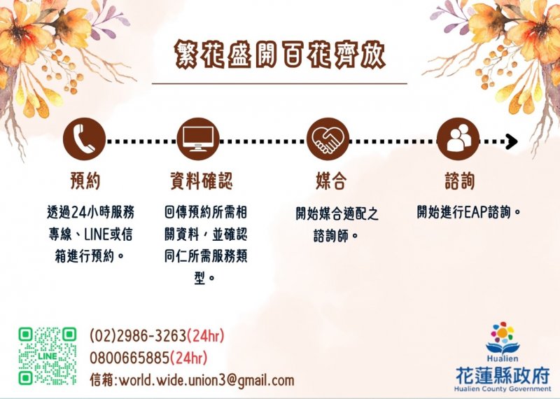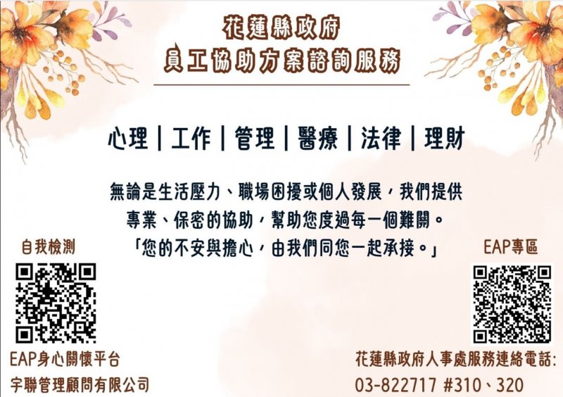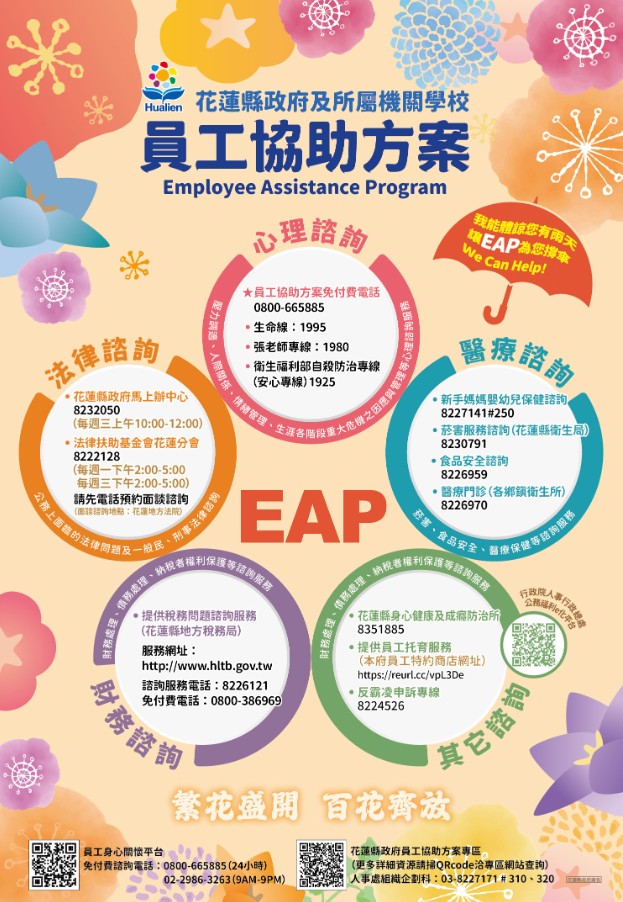 可至人事處網頁之員工協助方案專區(網址:https://eap.hl.gov.tw/eap/home/resouce_info.asp)內含宣導小卡、海報電子檔、疫情健康室、方案制度、諮詢服務、資源地圖、健康促進、心靈幽徑等。