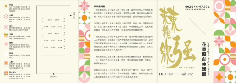 一、 國立臺東生活美學館將於6月7日至7月20日假花蓮市文化創意產業園區第11棟,舉辦「2025花東原創生活節-東東攏總強」特展,展區規劃13位花東工藝師們的原創工藝品展區、工藝師導覽、原創生活市集、音樂彈唱會及手作體驗活動。