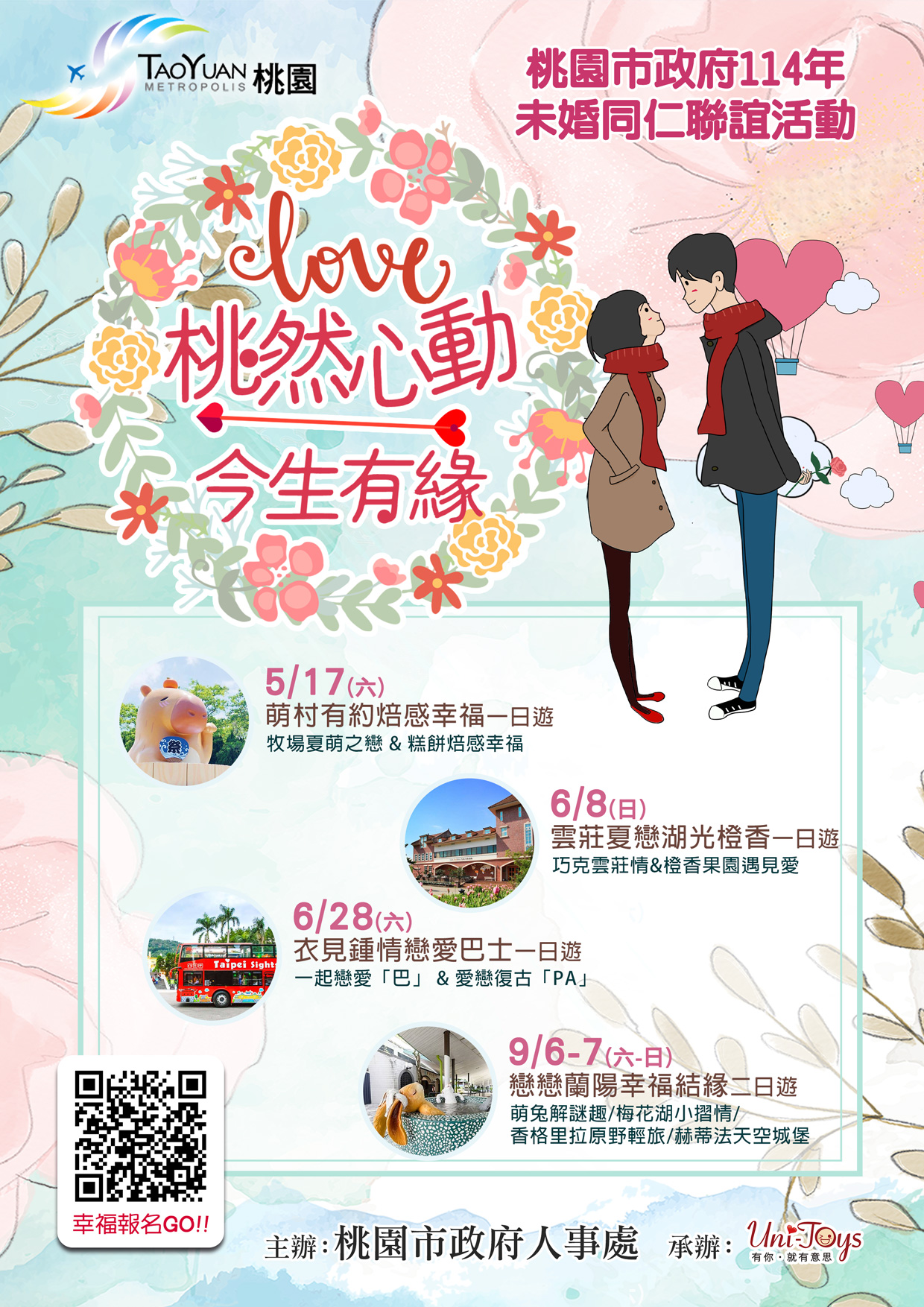 | 2、 | 其他縣市機關(構)學校所屬現職未婚公教及聘用、約僱、約用人員等,並開放桃園市轄內企業未婚人員參加。 |