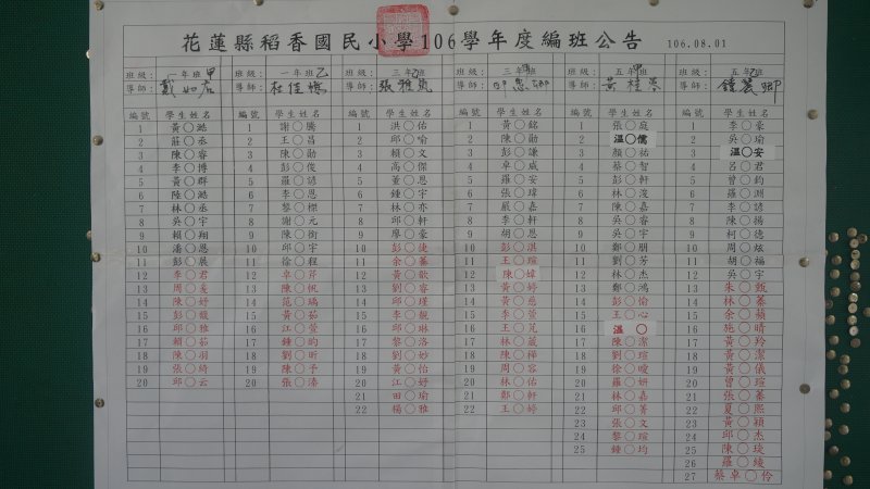 花蓮縣稻香國民小學106學年度編班公告 106.08.01