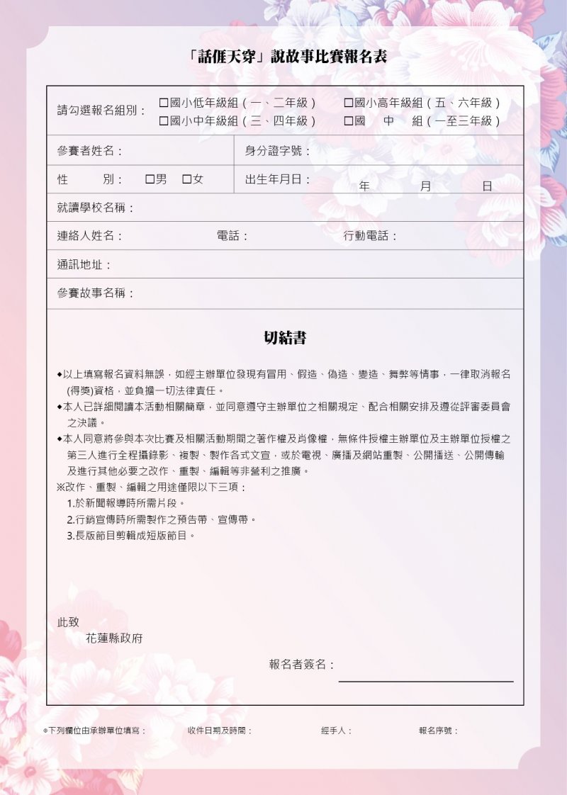 相關活動訊息參閱簡章及報名表1份,或請上花蓮縣政府全球資訊網-客家事務處網頁查詢。